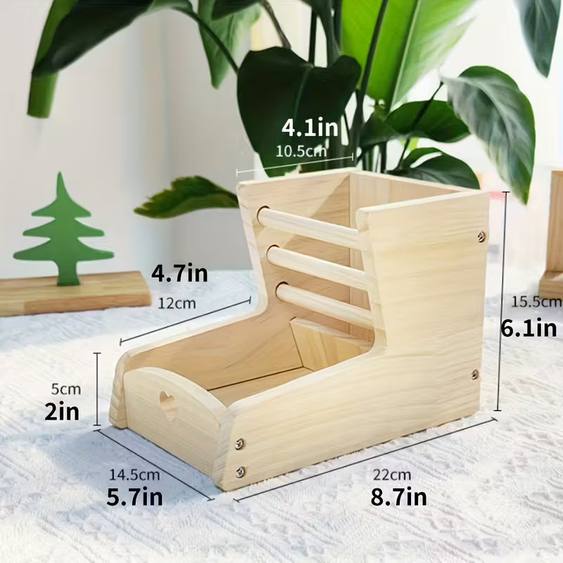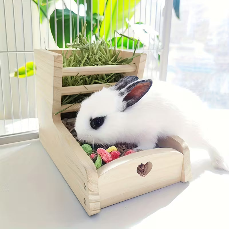 Sorge für eine saubere und effiziente Fütterung deiner Kleintiere! Unsere 2-in-1 Futterstation aus recyceltem Holz kombiniert einen integrierten Heuhalter mit einem praktischen Futternapf.