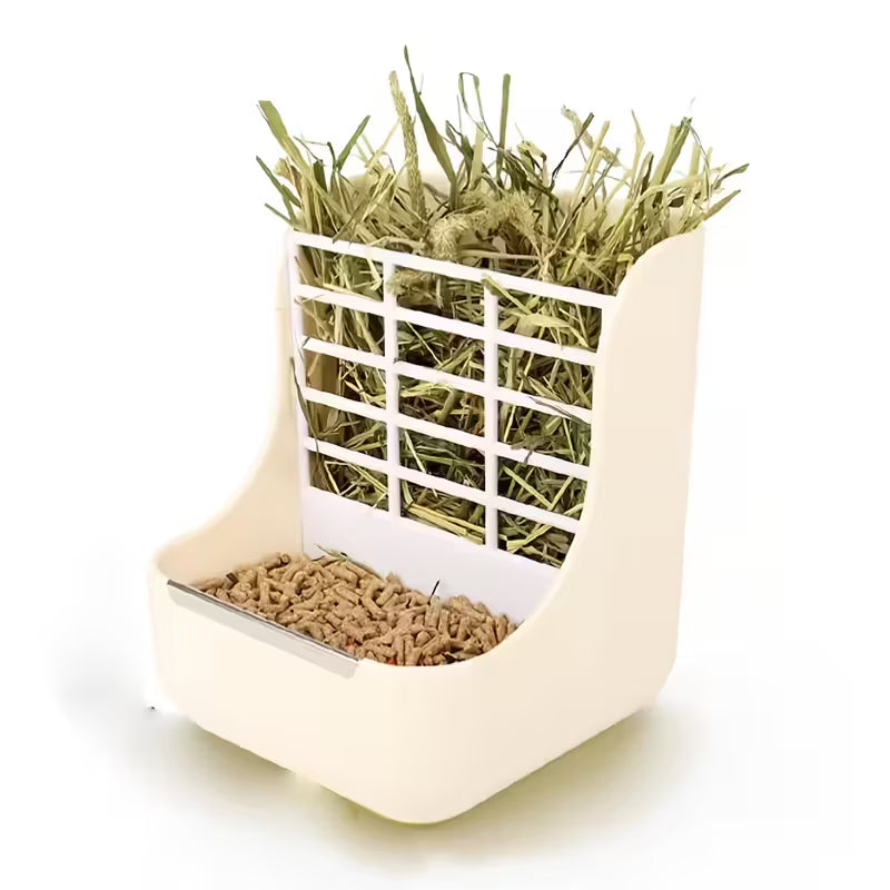 Diese praktische 2-in-1 Heuraufe aus robustem Kunststoff kombiniert eine obere Kammer für Heu mit einer unteren Schale für Pellets oder anderes Futter. Sie eignet sich ideal für Kaninchen, Meerschweinchen und andere Kleintiere und sorgt für eine saubere, platzsparende Fütterung im Käfig.
