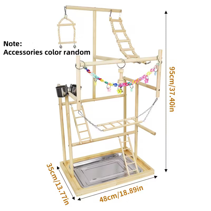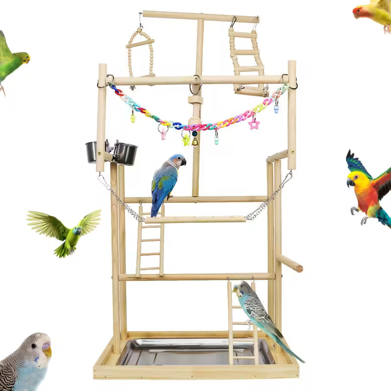 Bringe Abwechslung und Spaß in den Vogelkäfig! Unsere mehrstufige Holz-Sitzstange mit Seilschaukel, Leiter und Futternapf ist das ideale Zubehör für Papageien, Wellensittiche und andere kleine bis große Vögel.